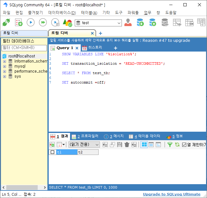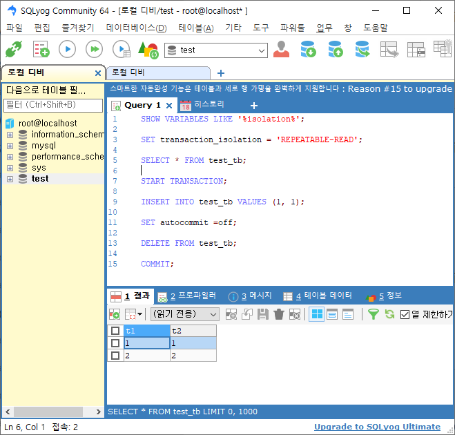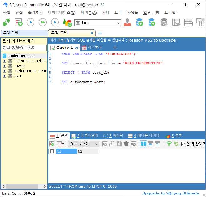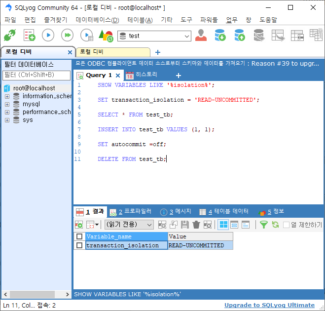 session2 트랜잭션레벨 설정 READ-UNCOMMITTED ![]() |