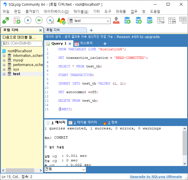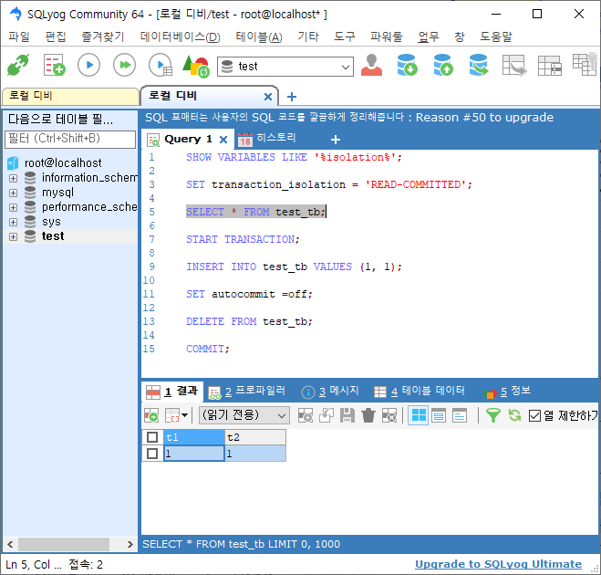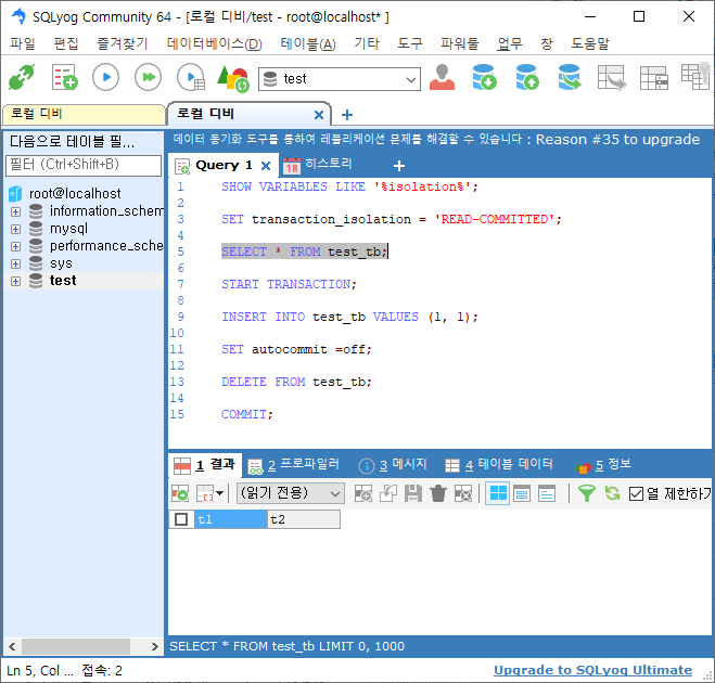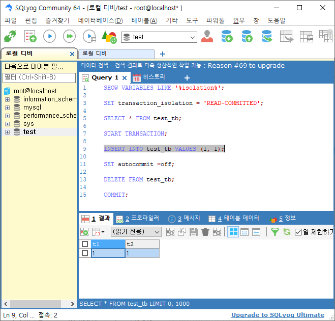 session2 트랜잭션레벨 설정 READ-COMMITTED ![]() |