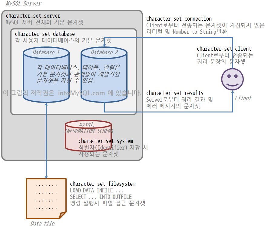 MySQL에서 설정 가능한 Character set 관련 변수들은 아래와 같은 것들이 있다.