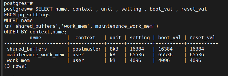 WHERE name in ('shared_buffers','work_mem','maintenance_work_mem')