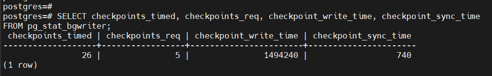 checkpoint_sync_time --체크포인트 완료를 위해 디스크 동기화에 소요된 평균 시간(밀리초).