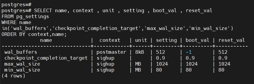 checkpoint_completion_target : 체크포인트 작업이 전체 주기의 몇 퍼센트에 걸쳐 완료될지를 제어 . 더 높은 값은 I/O 부하를 줄임